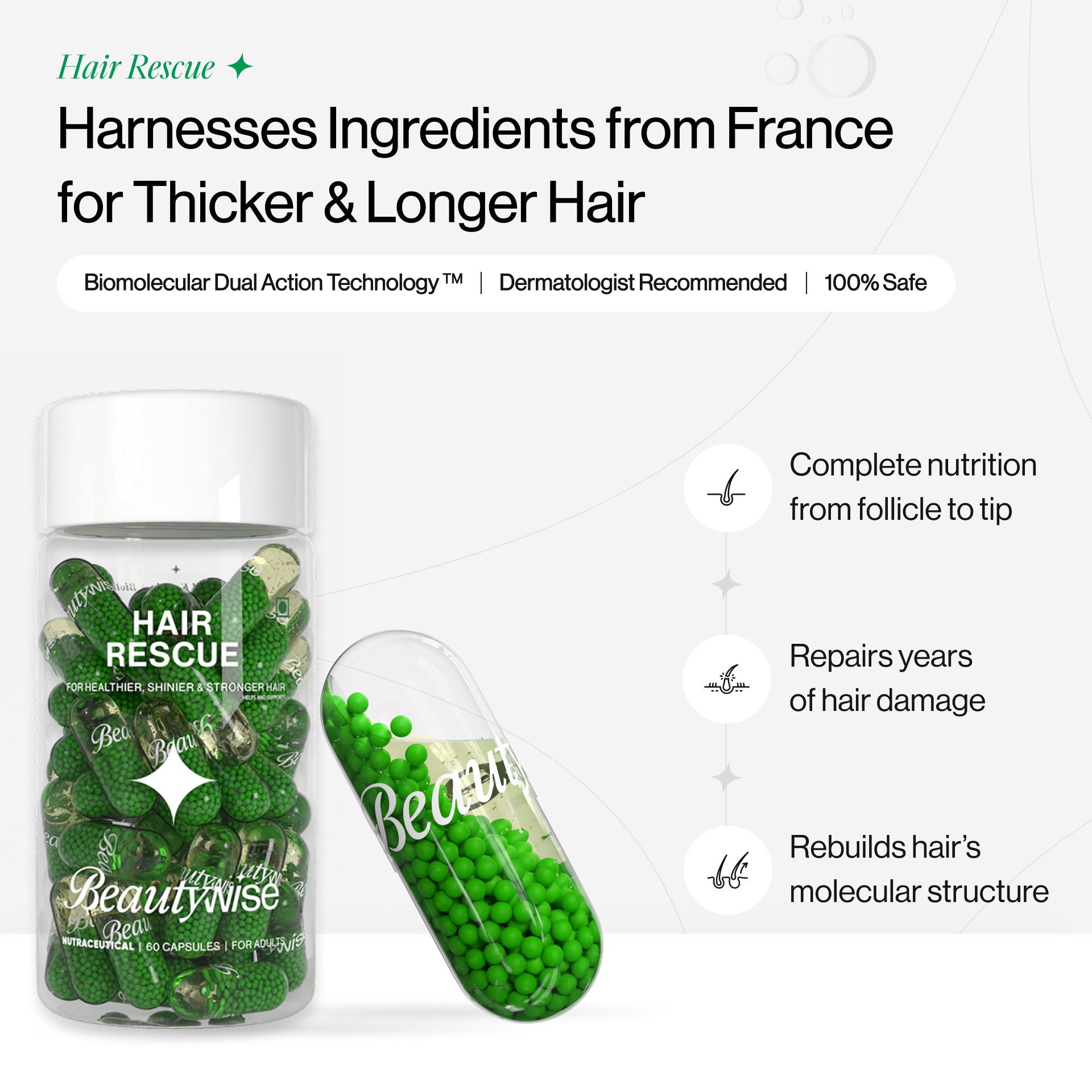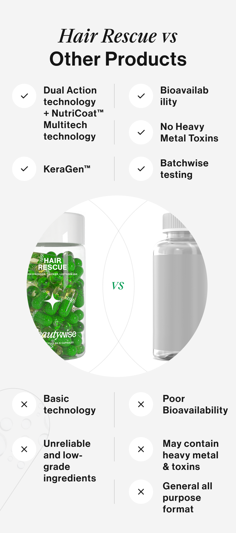 Hair Rescue has no side effects. The ingredients used are classified as dietary supplements & are within the RDA% recommended by ICMR.