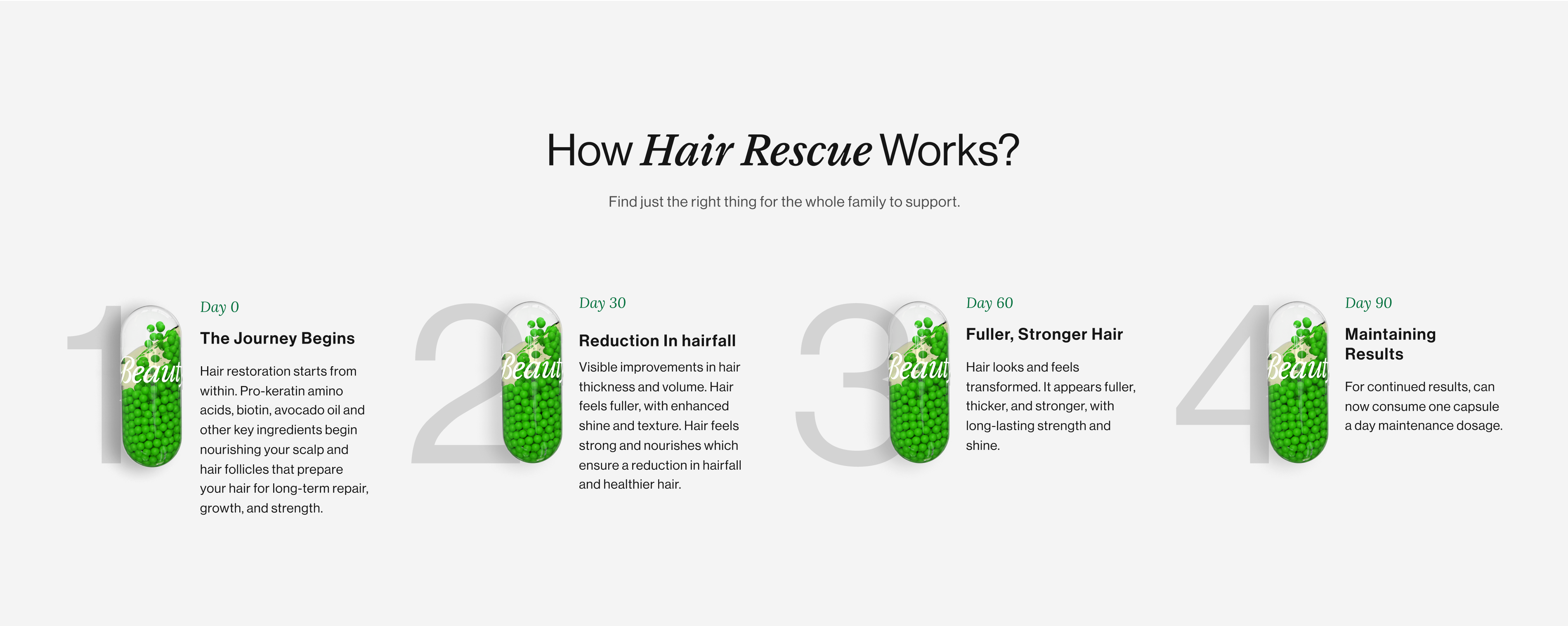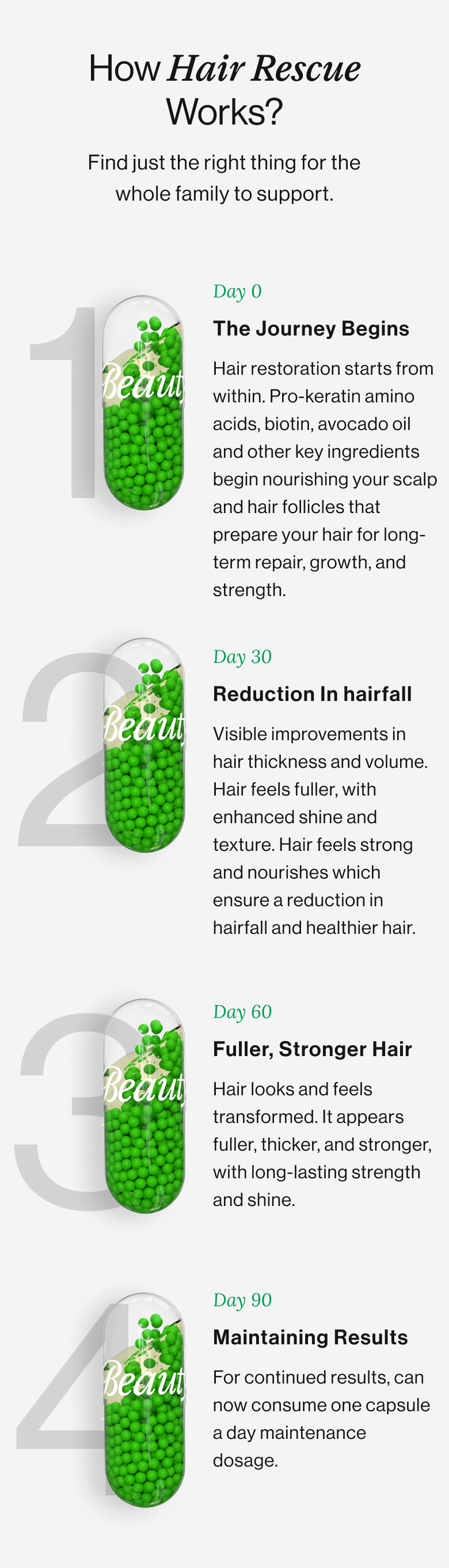 + Other Dual-Action Capsules: One capsule of each supplement after a meal. (Eg. one Hair Rescue capsule + one Skin Brilliance capsule taken together after breakfast and repeated after dinner)