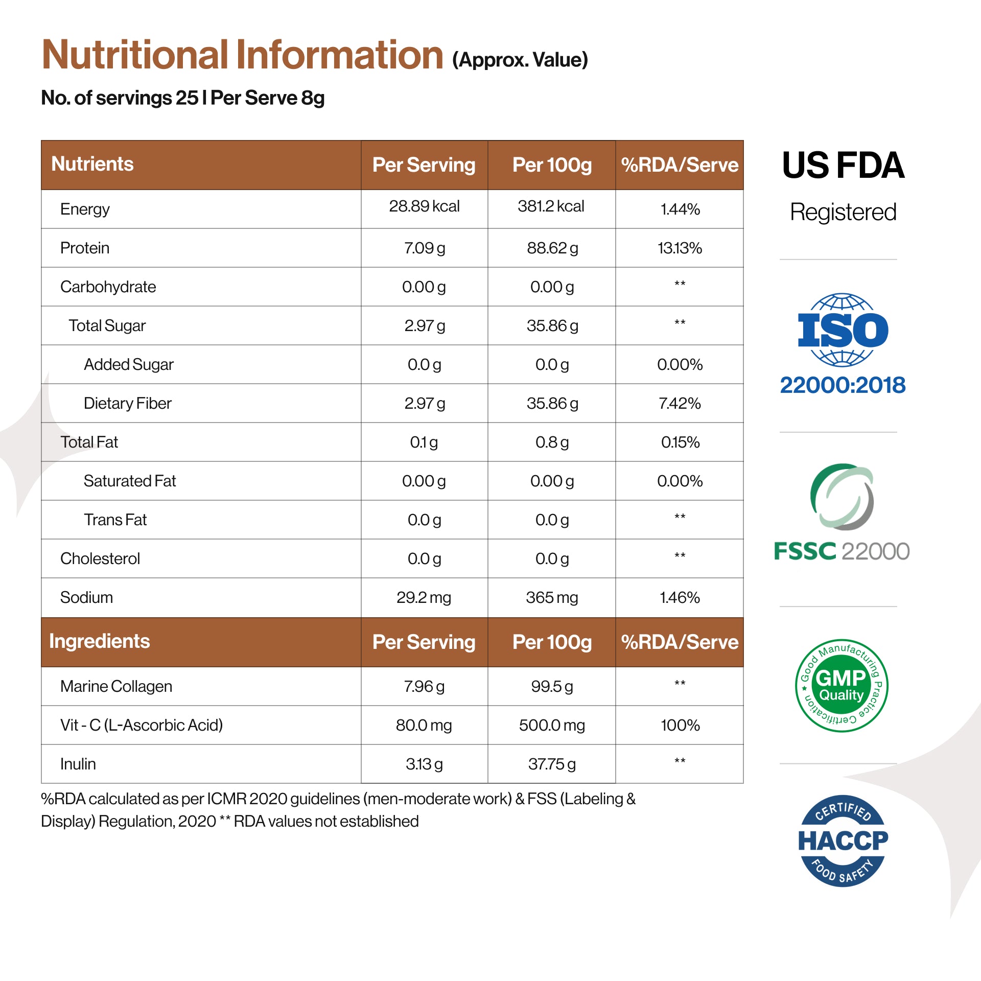 Take one scoop of Advanced Marine Collagen Proteins. Mix the powder in 100ml water, or in your favourite drink. You can even add it to your daily coffee/ tea and other hot beverages. It should be ideally consumed on an empty stomach in the morning or as an evening snack.