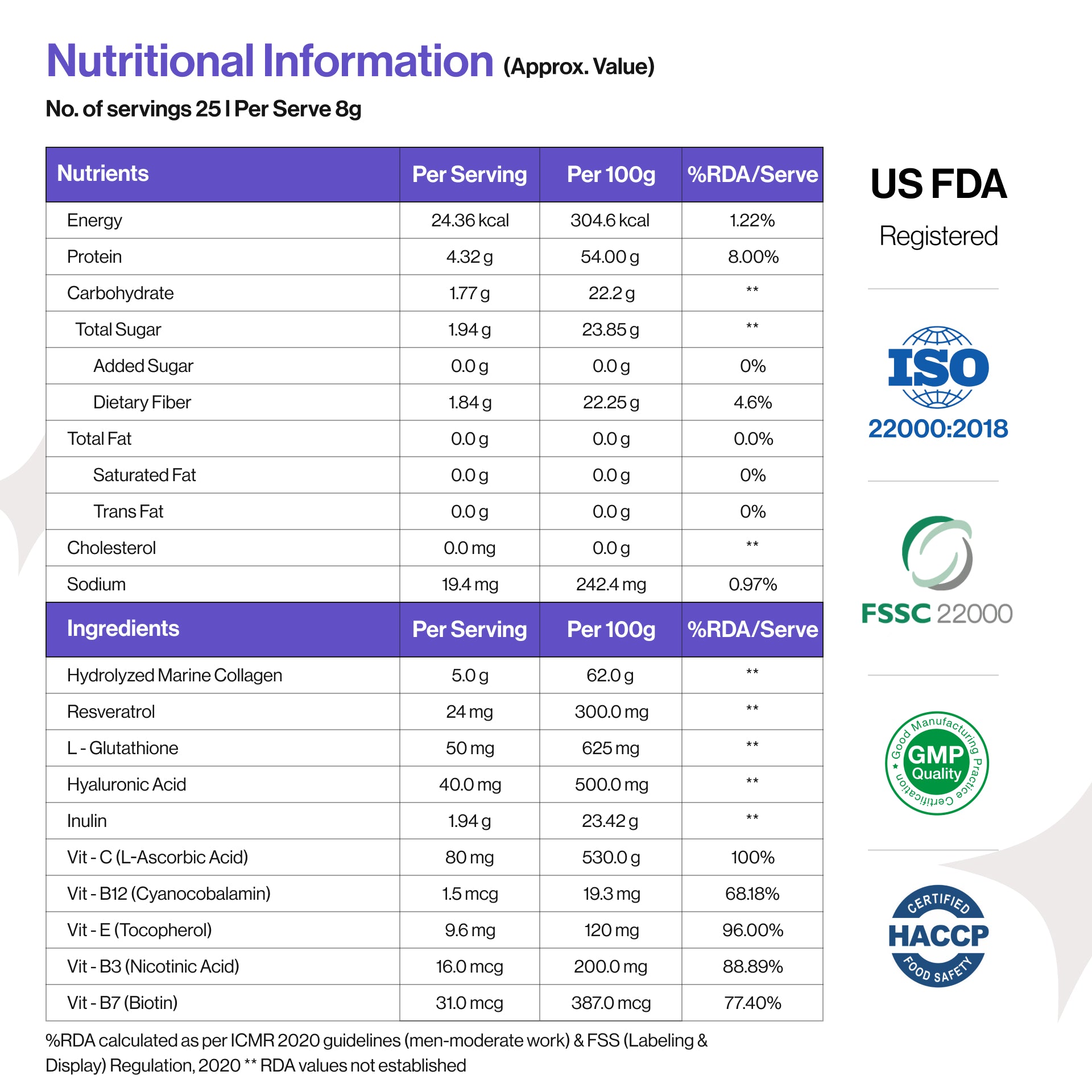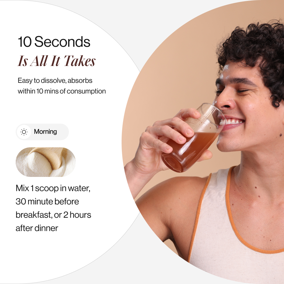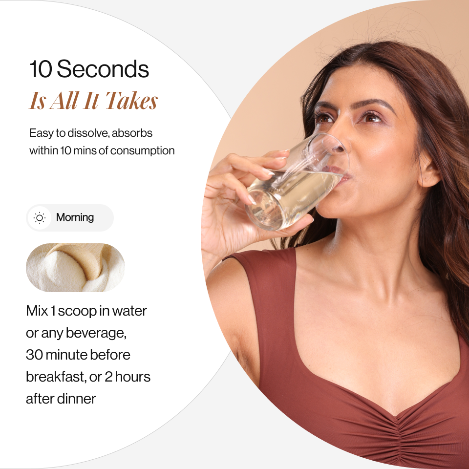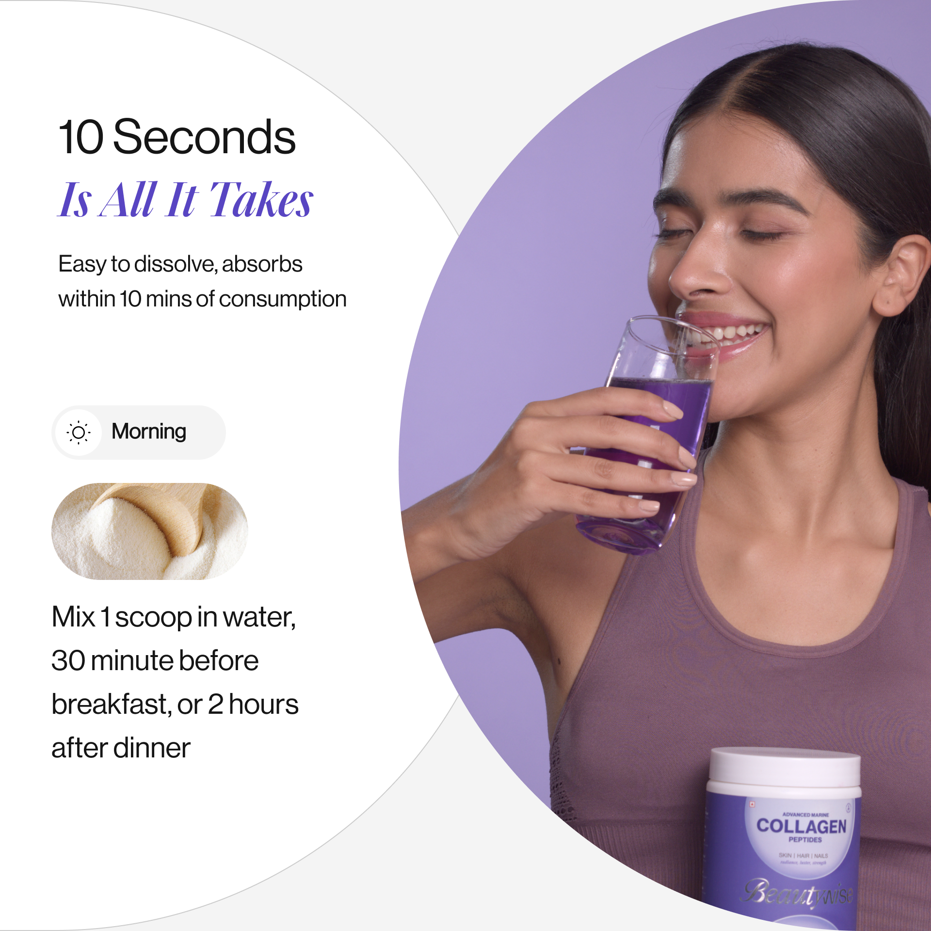 Take one scoop of Advanced Marine Collagen Proteins. Mix the powder in 100ml water, or in your favourite drink. You can even add it to your daily coffee/ tea and other hot beverages. It should be ideally consumed on an empty stomach in the morning or as an evening snack.