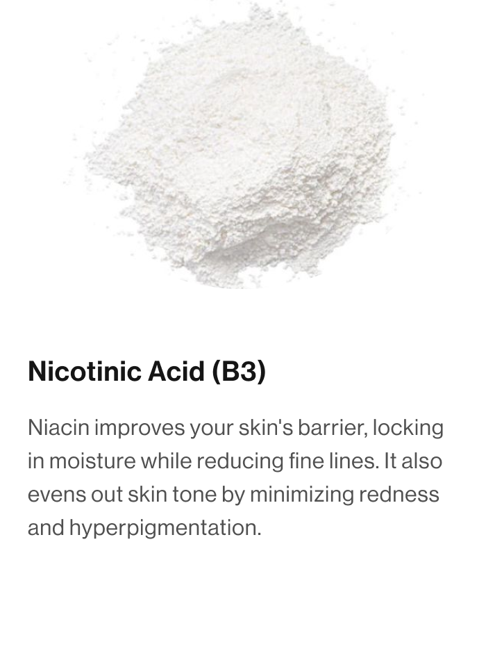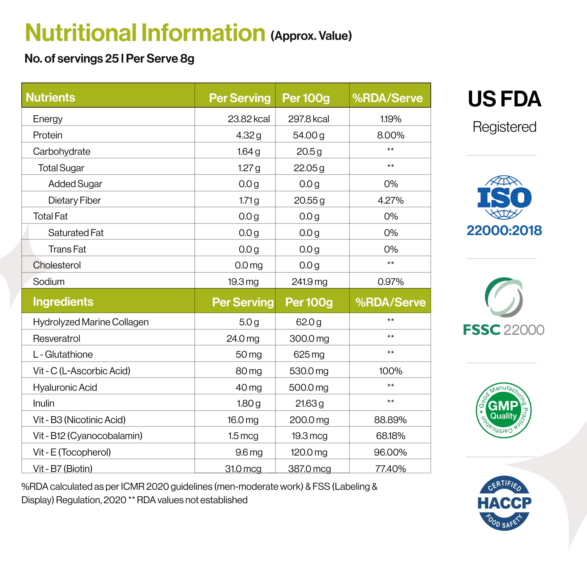 L-Glutathione, Resveratrol, Hyaluronic Acid, Biotin, L-Ascorbic Acid (Vitamin C), Tocopherol (Vitamin E), Cyanocobalamin (Vitamin B12), Nicotinic Acid (Vitamin B3/Niacin), Inulin dietary Fibers, Stevia Herbal Sweetener