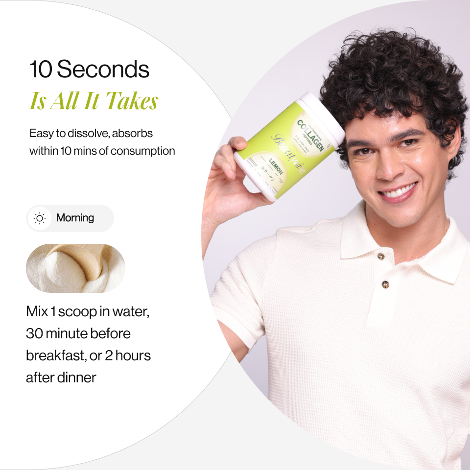 We lose collagen at a rate of 1.5% from the age of 25. It is recommended to keep taking collagen supplements to ensure sufficient collagen levels are maintained by your body so you keep looking your best.