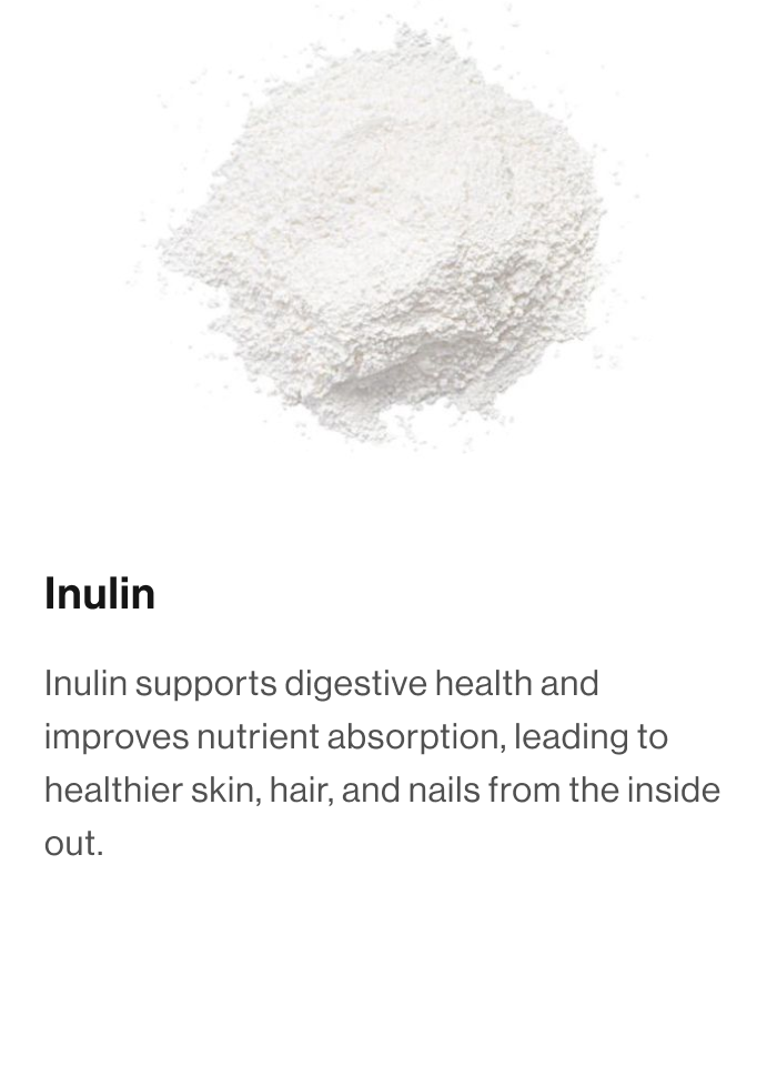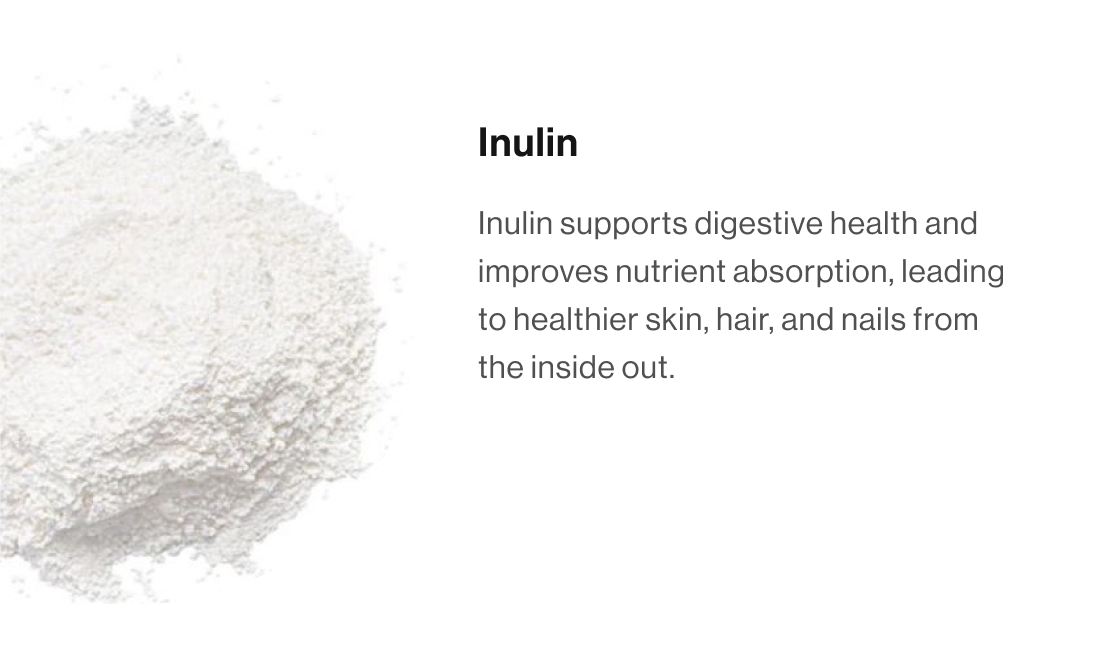 Dietary Fibers (Inulin)Improves gut health, supports nutrient absorption for skin regeneration, and reduces inflammation, leading to clearer, healthier skin.Antioxidants (100% RDA Vitamin C)Protects skin from oxidative stress, boosts collagen production, and enhances the bioavailability of collagen peptides for improved skin repair and anti-aging effects.Unflavored and PureTasteless, odorless, and colorless, with no artificial additives for a clean, natural experience