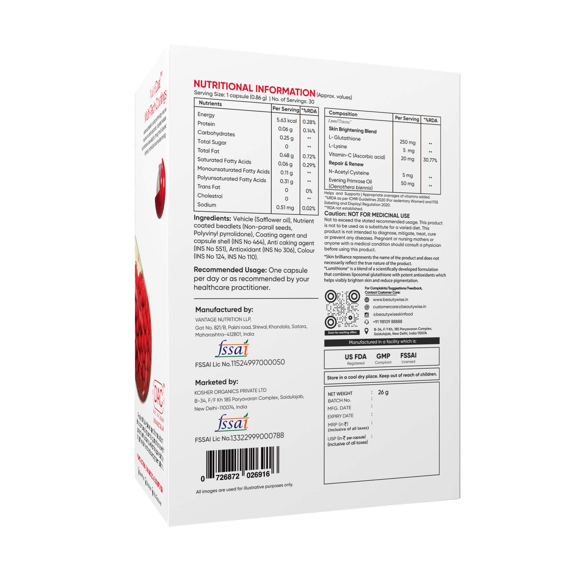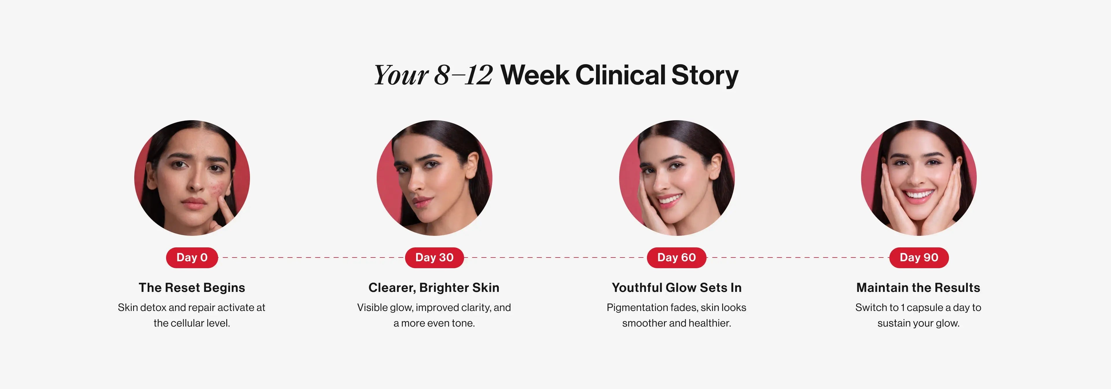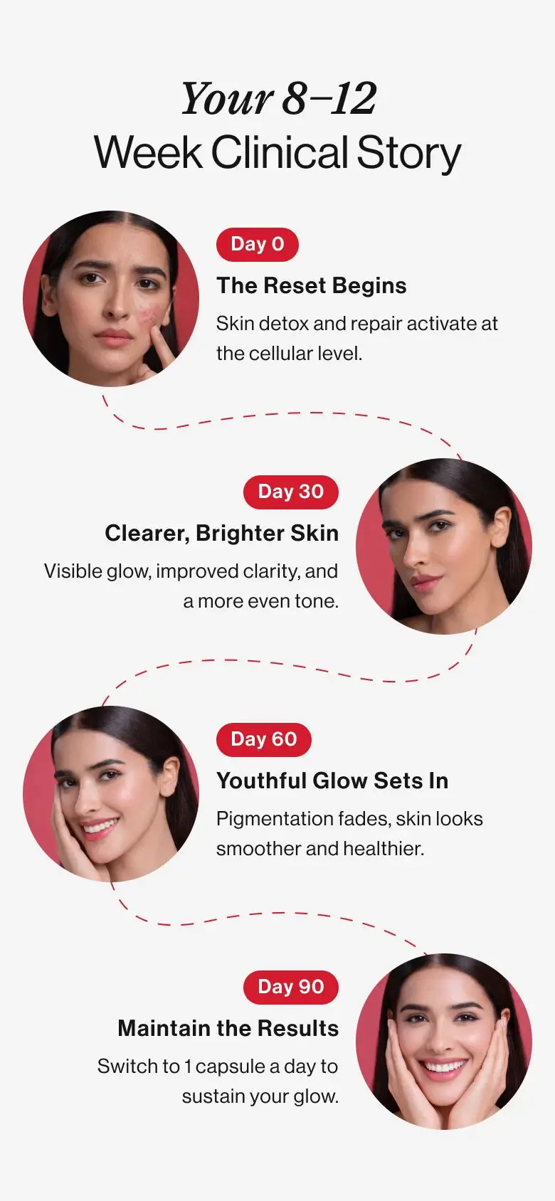 Consistently taking 2 capsules per day for 2-3 months can help achieve visibly reduced skin pigmentation, increased skin elasticity and significant skin radiance.