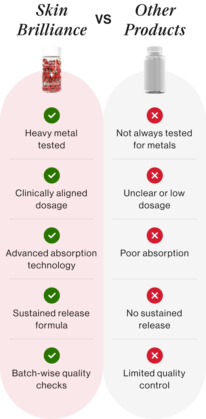 Skin Brilliance has no side effects. The ingredients used are classified as dietary supplements & are within the RDA% recommended by ICMR.